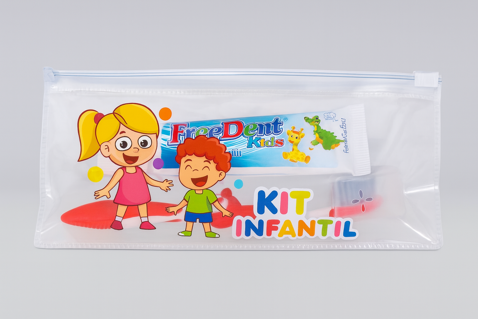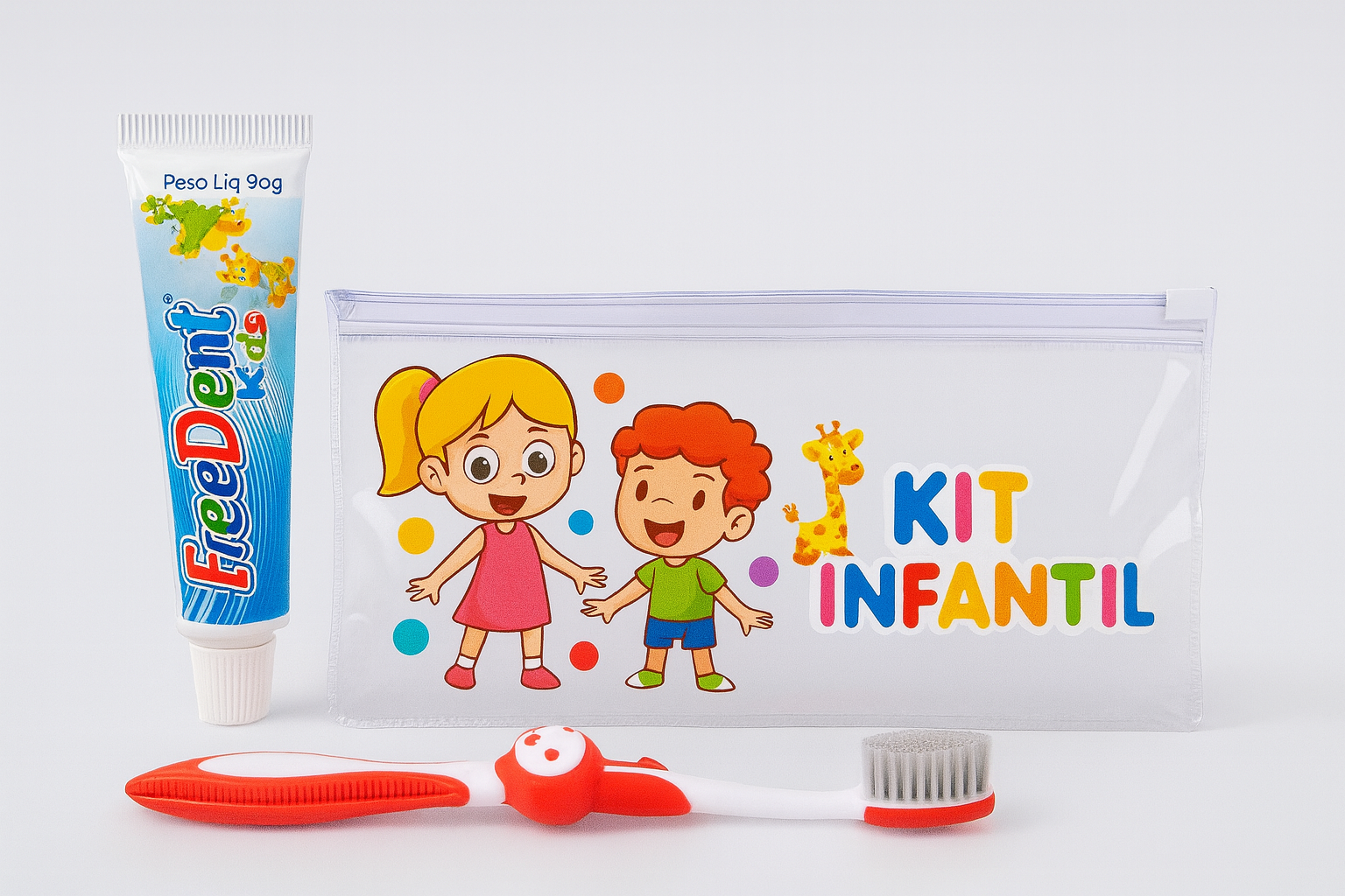 Kit Higiene Bucal contendo: – Estojo Plástico Personalizado. – Escova Dental Adulto com 34 tufos de Cerdas. – Creme Dental Freedent 30g – Fio Dental (25m)