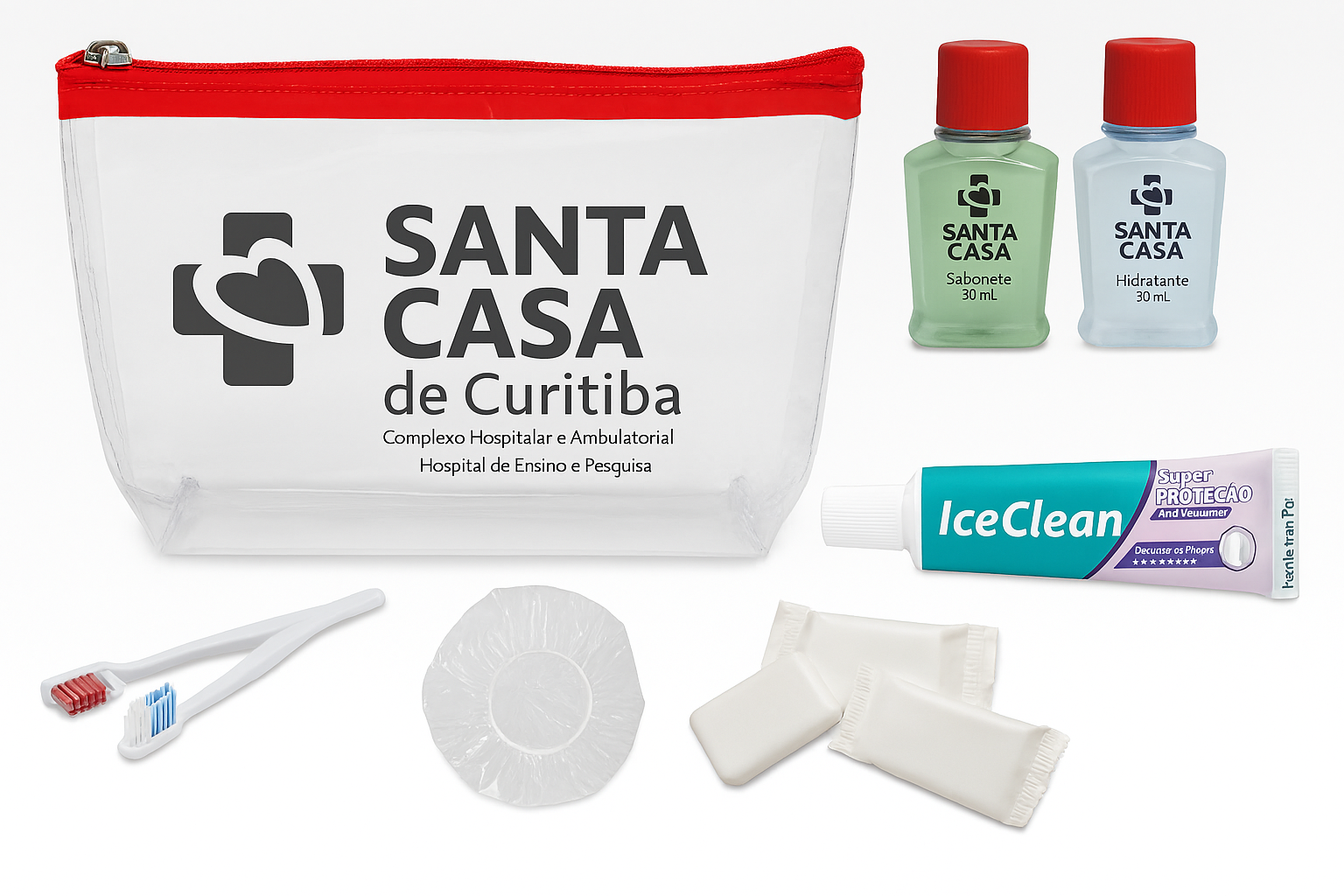 Kit composto por : -01 Necessaire em Bagum com Fechamento em ziper Gravada ate 2 cores. – 01 Shampoo 2 em 1 Frasco 35 ml Personalizado em Hot Stamping. -01 Creme Dental Freedent 30 gramas. -01 Escova Dental Simples. -01 Sache de Touca de Banho. -04 Hastes . – 01 Pente Personalizado em Hot Stamping. -01 Sabonete Barra 20 gramas.