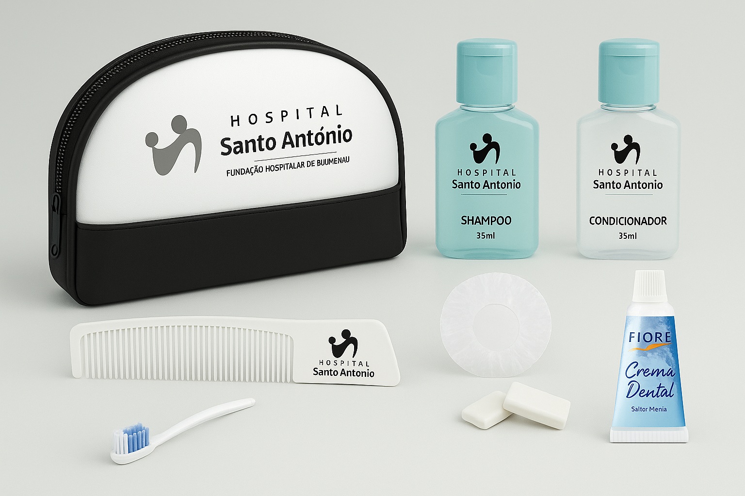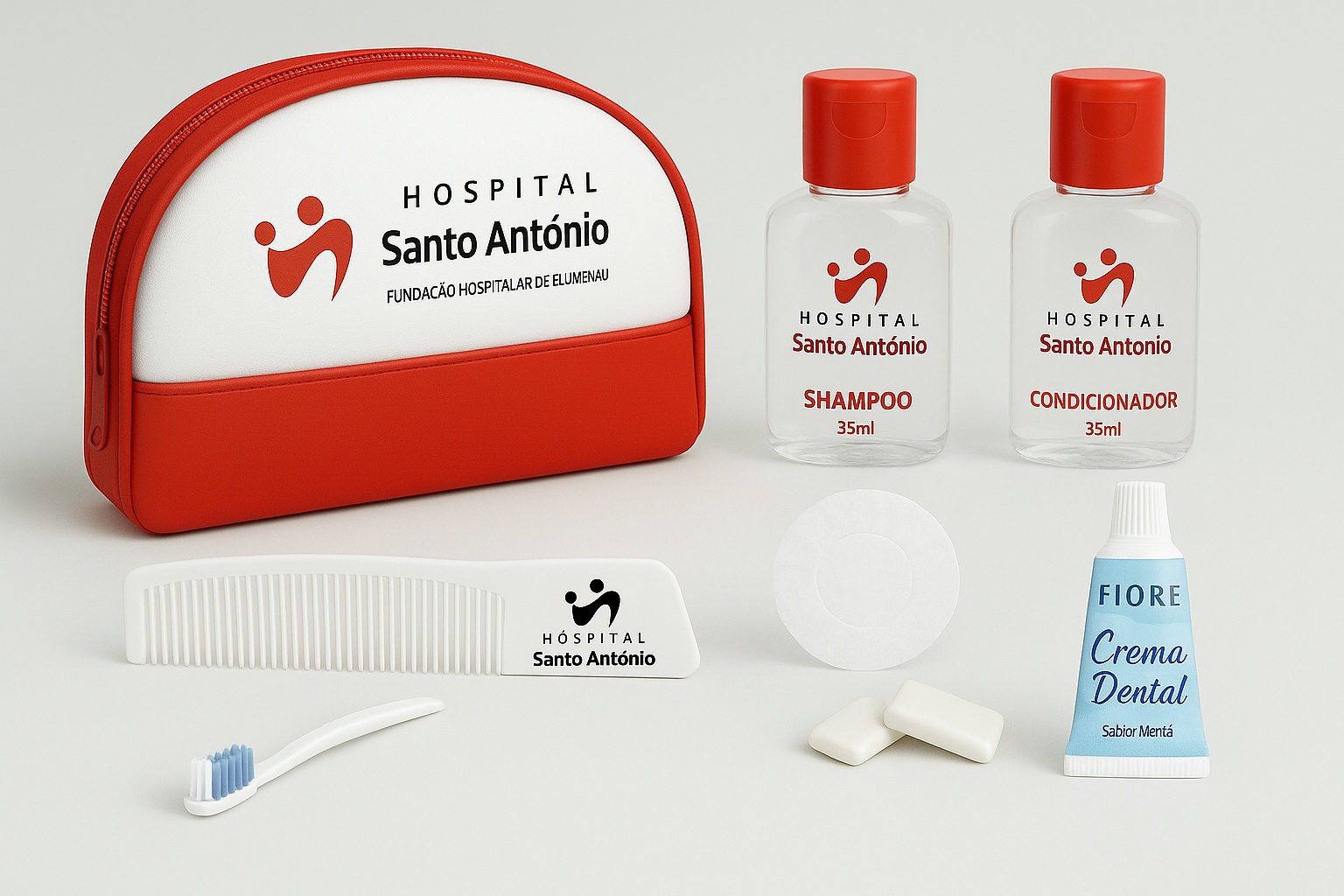 Kit composto por : -01 Necessaire em Bagum com Fechamento em ziper Gravada ate 2 cores. – 01 Shampoo 2 em 1 Frasco 35 ml Personalizado em Hot Stamping. -01 Creme Dental Freedent 30 gramas. -01 Escova Dental Simples. -01 Sache de Touca de Banho. -04 Hastes . – 01 Pente Personalizado em Hot Stamping. -01 Sabonete Barra 20 gramas.